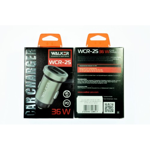 Автомобильное зарядное устройство WALKER WCR-25, 3А, 36Вт, USBx1/Type-Cx1, быстрая зарядка QC 3.0+PD, черное