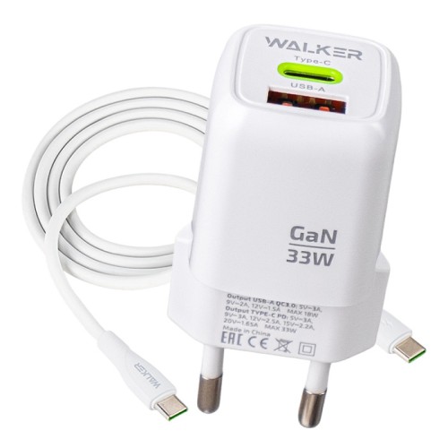 Сетевое зарядное устройство WALKER WH-71 GaN, 2в1, 3А, 33Вт, USB/Type-C, поддержка QC/PD + кабель Type-C-Type-C, белое
