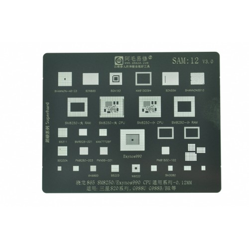 Трафарет BGA IC Amaoe 0,12мм Sam-12 Exynos 990/865/SM8250/G988U/G988B/BR/SHANNON-A5123/SDR865/BGA153/KM9130094/SDX55M/SHANNON5510/S5311/SMR526-001/MAX77705F/S5200A/PM8250-003/PMX55-001PMB150C-102/9468B3/S5203/W9020/SM3080